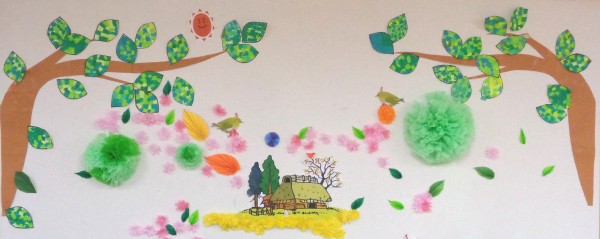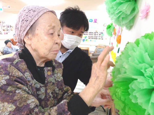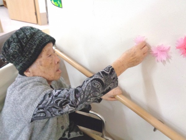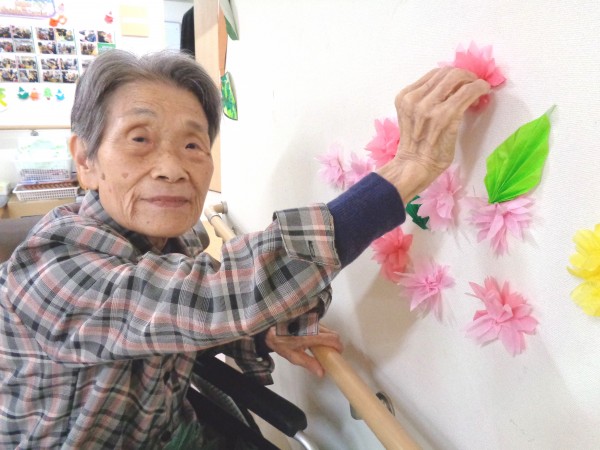 入居者様が作った桜を壁に散りばめて頂きました。「ここでいいかしら。」