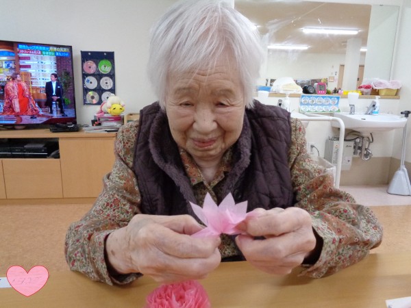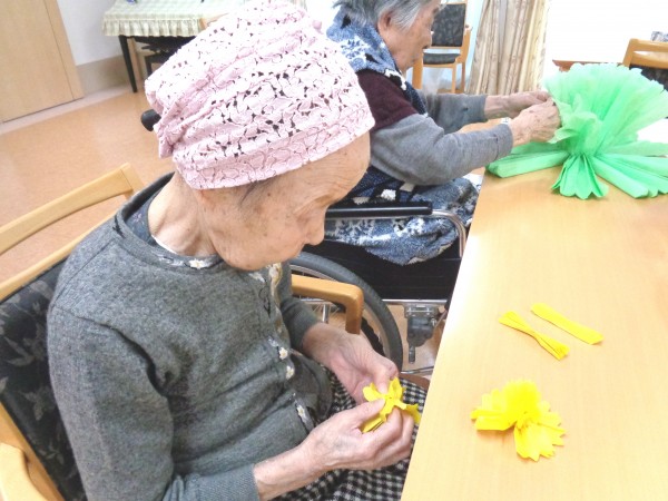 桜作成の準備中です。これが入居者様の手作業で綺麗な桜になっていきます。手作業をしながらの会話も楽しみのひとつです。お喋りはたのしいですよね。そんないくつかのシーンをご紹介します。