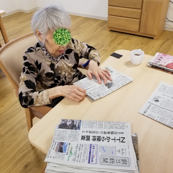 こんにちは。本日は朝からご入居者様が新聞折りのお手伝いをして下さってます