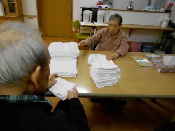 本日1階ではタオルたたみをお手伝いしてくださるN様とN様とK様! 『これこっちに置いて〜』 『端と端上手くできない…』 など会話されていました。