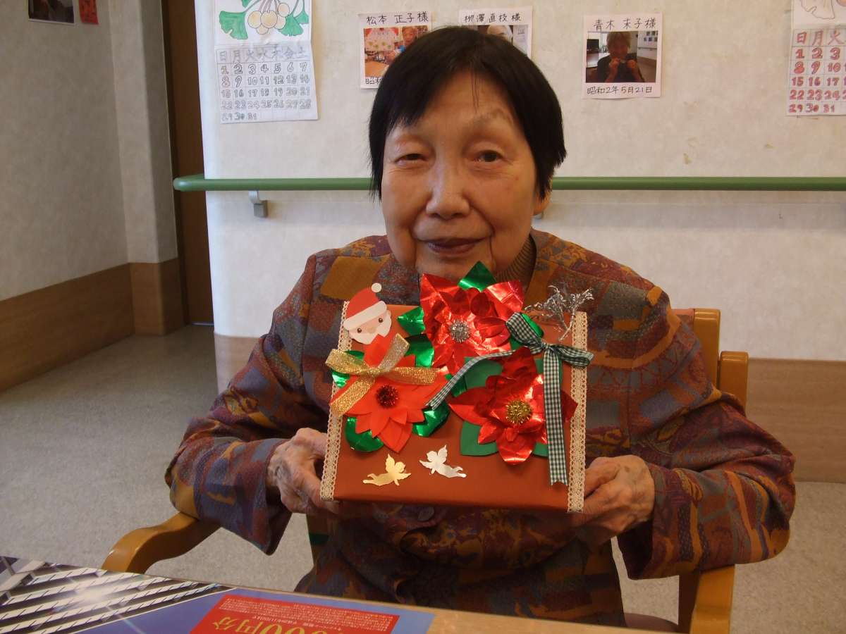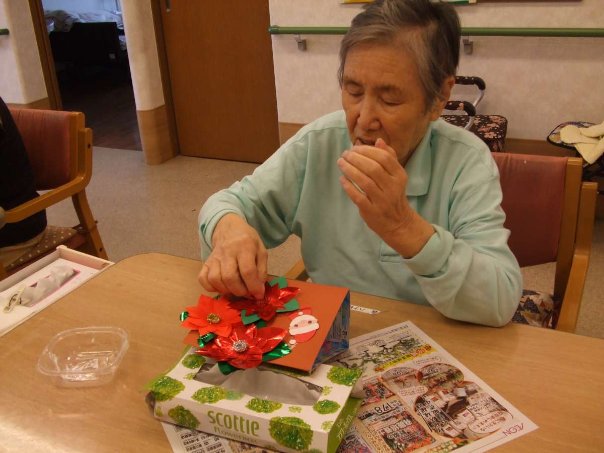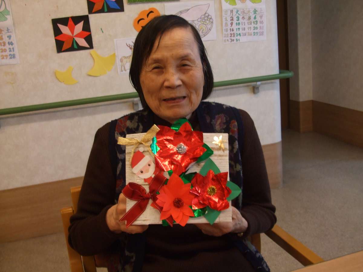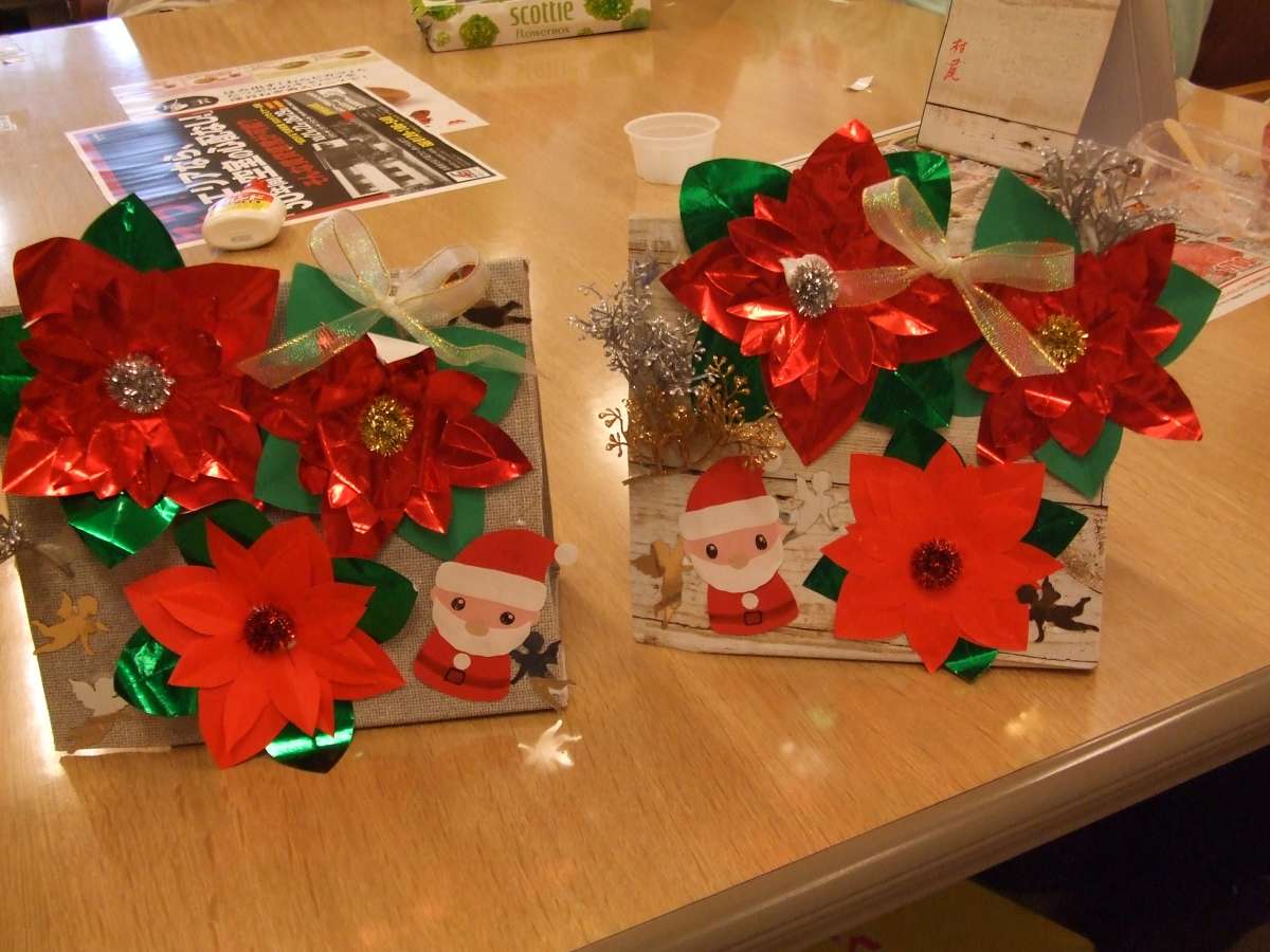 段ボールで作った台紙に包装紙を貼り付け、ポインセチアやリボン、サンタクロースなどの小物を、皆さま思い思いに飾り付け~~~