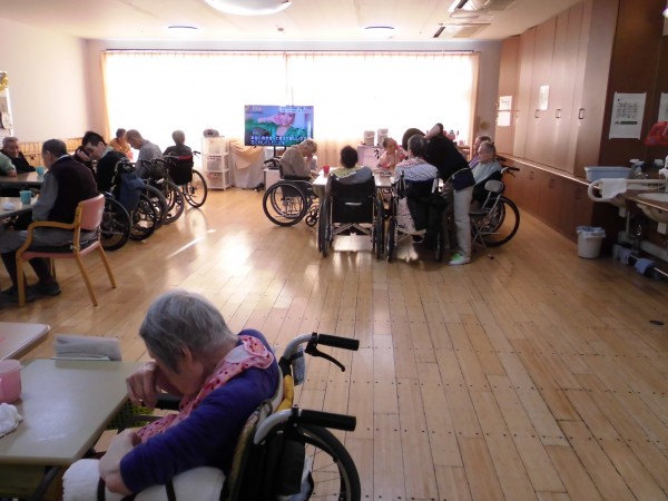 エレベーター上がられて右側では、利用者様、皆様が日中フロアで過ごされております。お食事や、おやつ時間、レクリエーションなどでお集まりになられて日常生活を過ごされております!
