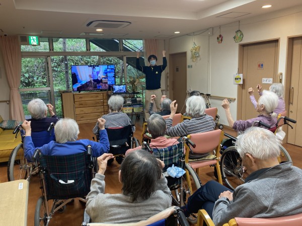 体操がはじまるにつれ、画面の先生の動きを真似するようになり