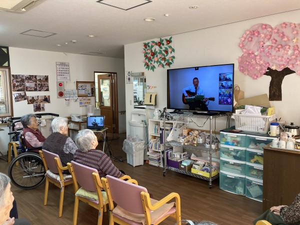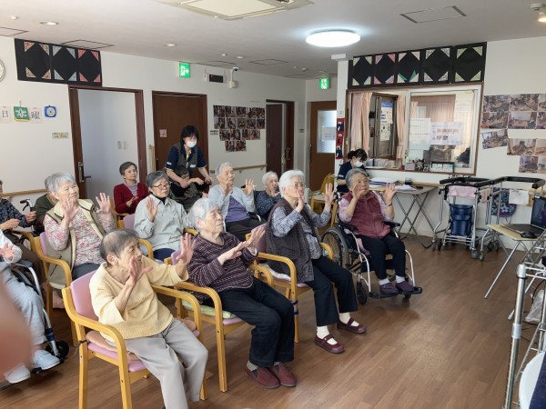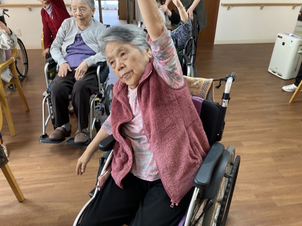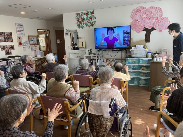 利用者様もリモートでの体操は慣れて、テレビの中の岡◯指導者の動きをまねして