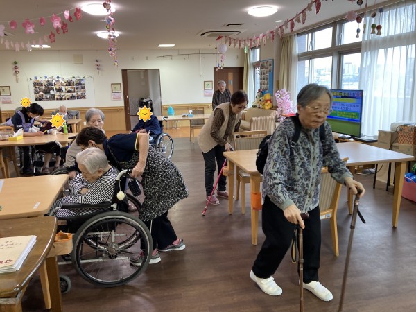 皆さまも積極的に参加してくださり、職員の声掛けで非常口へ集合します。