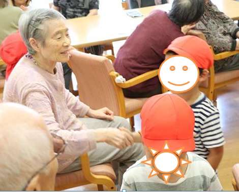誕生会には、ご近所のきたしば保育園年少組(3歳児)がお祝いに訪問、お誕生日を迎えられた3名のご利用者様一人一人にお誕生カードをプレゼントしていただきました。