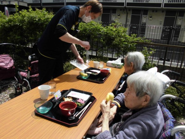今年は施設の庭で「お花見弁当」になりましたが・・・