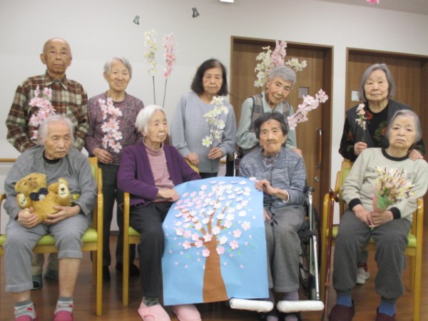 こんにちは!グループホームみんなの家・あきがせの介護ブログです。よろしくお願いいたします。2階で桜を貼り絵したものと一緒に写真を撮りました。皆様笑顔が素敵です。