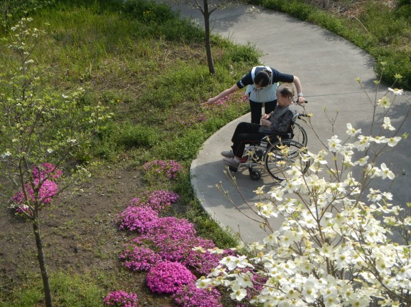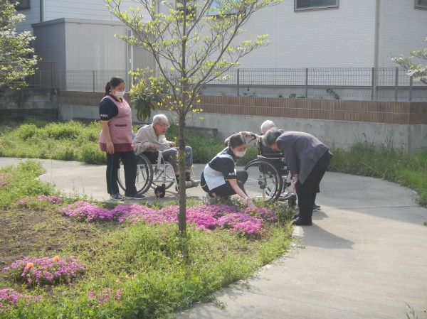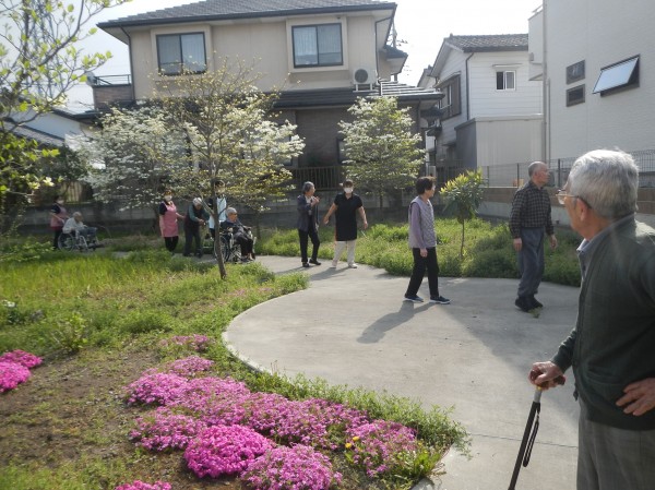 暖かい春の日差しが注ぎ込む中庭に、みんなで散策に出てみました。