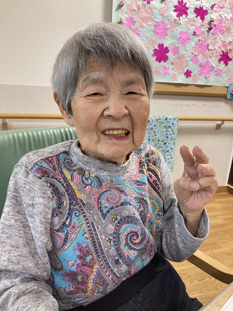 こちらは、フロアで桜の折り紙をバックに”はいっチーズ♪”