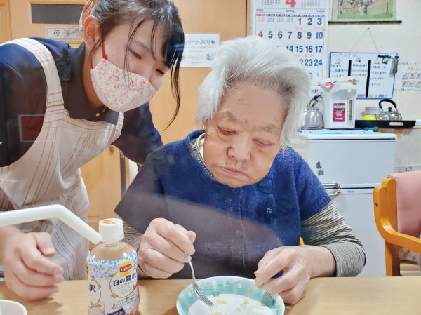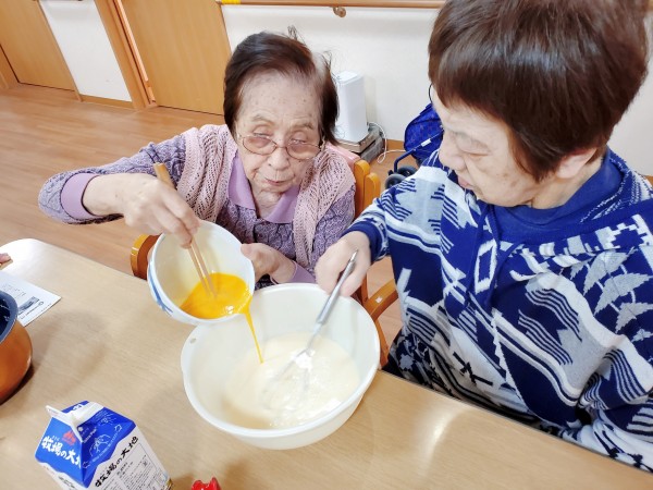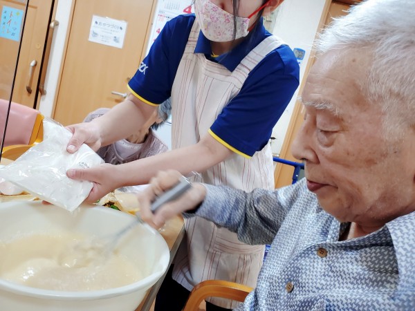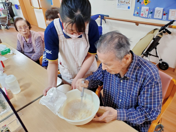 各フロア、利用者様とケアスタッフが一緒に美味しいおやつをつくる日を設けています。
