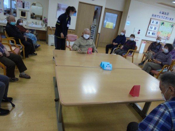 向かい合わせになってうちわであおいで先に武士をお城に連れてった人が勝ち! というゲームです!