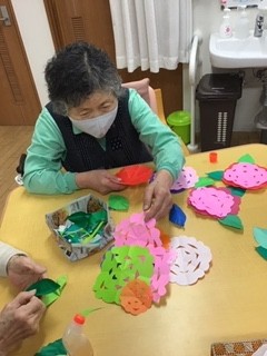 色違いのバラを2枚重ねて、葉も貼りつけて