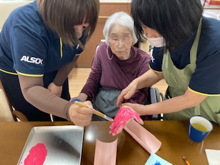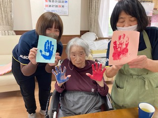 手のひらに赤い絵具を塗ったら「いやだぁ」と仰ってました…