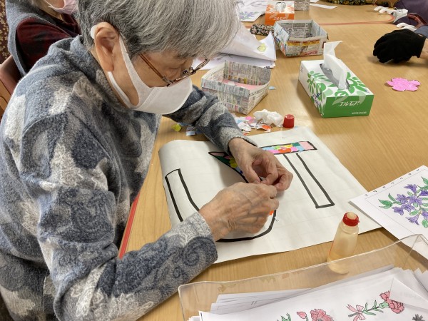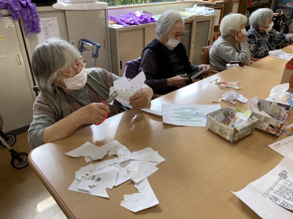 4月の午前レクの時間にぬり絵をたくさんして頂き、塗って頂いたものをハサミで切ったり、