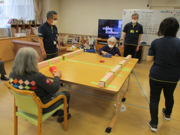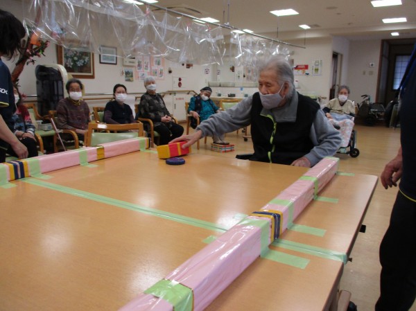 円錐状のパックを打ち合い相手陣地にパックを落とした回数で勝ち負けを