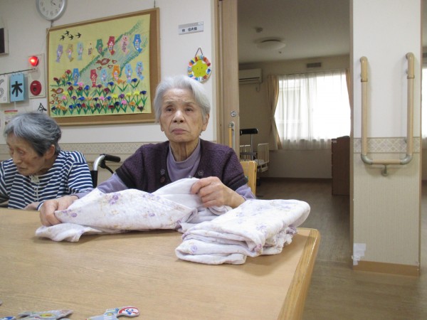 毎日の洗濯物たたみは、ご入居者様にお願いしています。