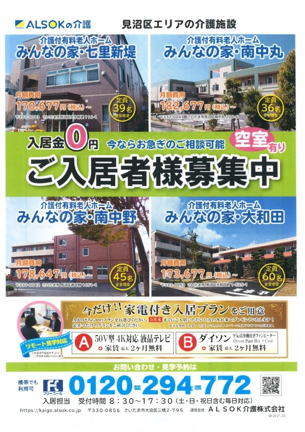 ALSOK介護株式会社【今だけ!】見沼区介護有料老人ホーム4ホーム限定キャンペーン!ご入居者様募集中!!【家電付き入居プラン!】
