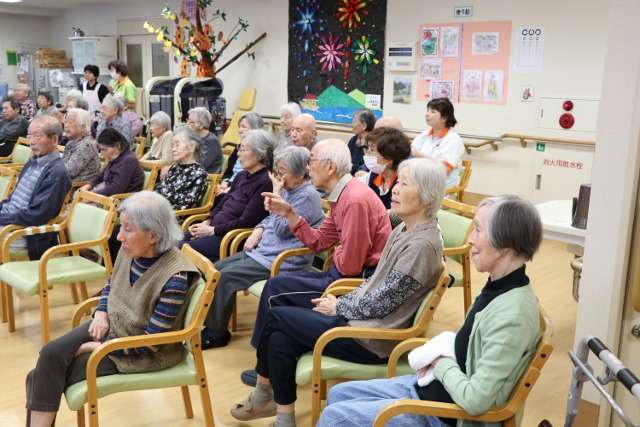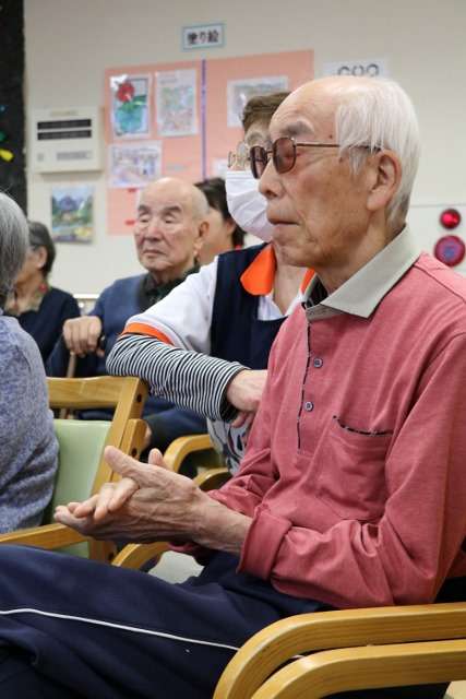 みなさんが演奏してくれました。ご利用者の皆様方、自然に体でリズムを取られたり、手をたたきリズムに乗ってスイング