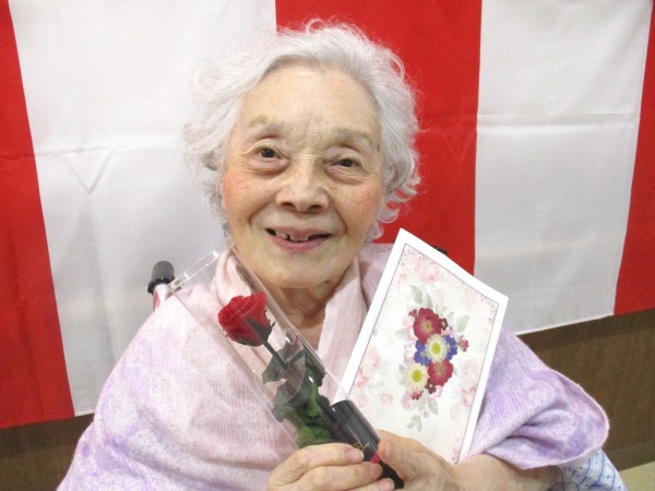 贈り物を手に紅白幕の前で米寿の撮影です。