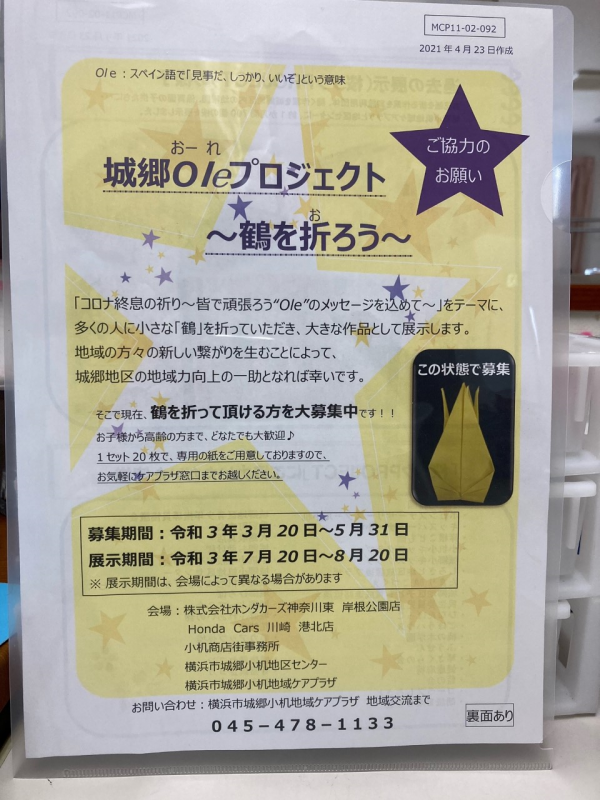 「城郷Oⅼeプロジェクト~鶴を折ろう~」の協力の依頼が