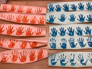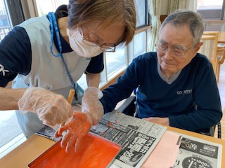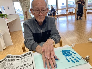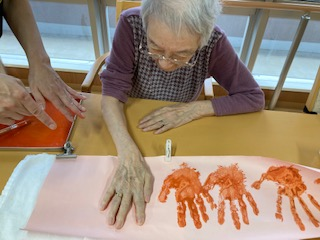 「手に絵具を塗りますよ」と言ったら「えー何するの?」と驚かれていました。
