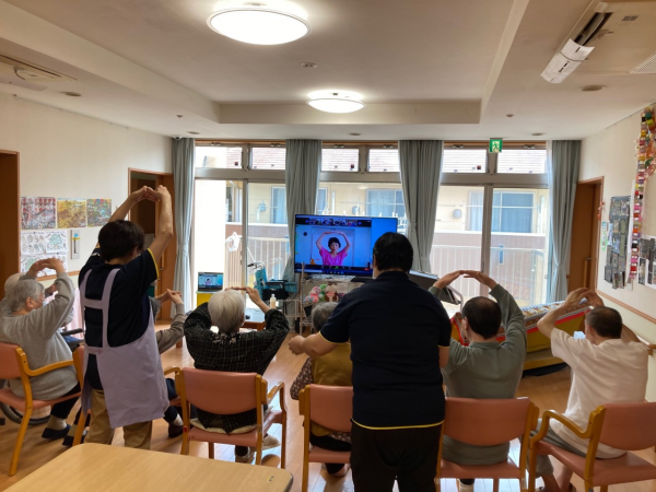 回数も重ね皆様リモートにもなれ画面に映った自分たちや他の事業所の入居者様、岡庭講師に手を振ったり楽しまれ参加しています。
