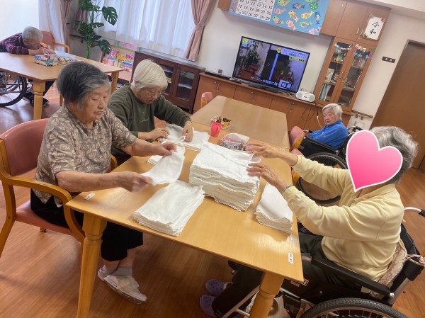 ◉『みんなでやれば早いから、やるわよ〜♬』とおしぼりタオルを畳んでくださる優しい女性入居者の皆様♡