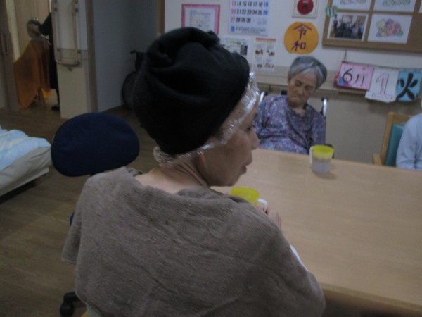 ヘアカラーをされたご入居者様は、「恥ずかしいわ」とのことで、後ろ姿を撮らせていただきました。