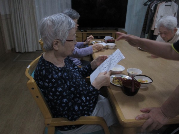 メニューは、いつもご入居者様に読み上げて頂いています。