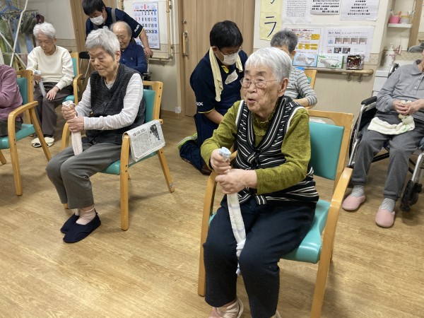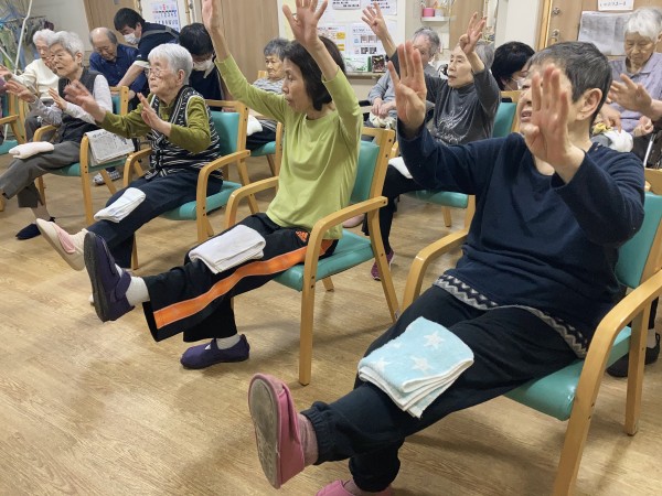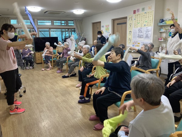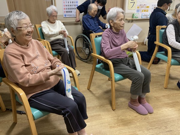 タオルを足にのせてバランスをとったり、ブンブン回したりと元気よく参加されました。