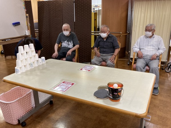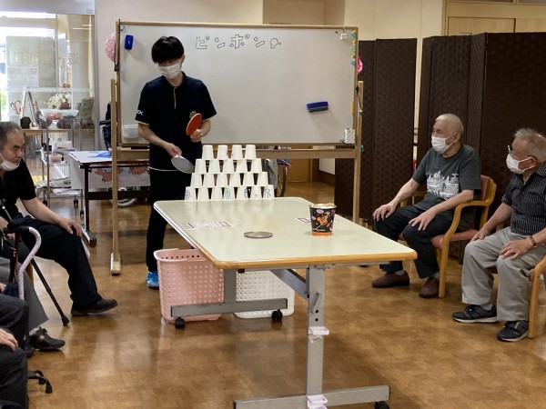 ピンポンは卓球のラケットと球を使って、紙コップのタワーを倒します。