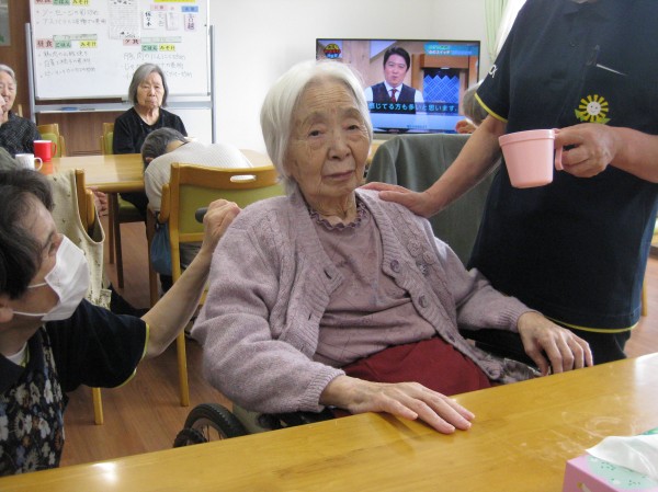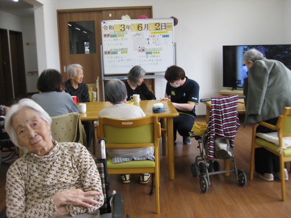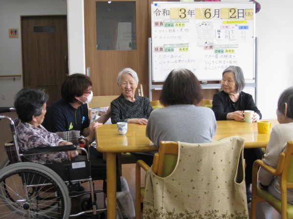 こんにちは!グループホームみんなの家・あきがせの介護ブログです。よろしくお願いいたします。ある日の様子です。お茶を飲みながら何気ない会話をしました。ホット一息!!ほっとされたひと時でした。