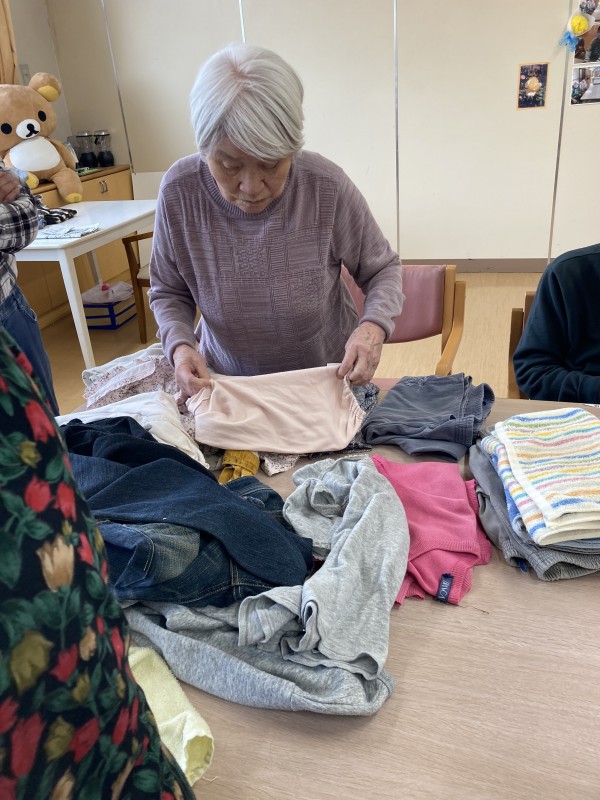ホームでの生活の中で,家事をたくさん手伝ってくださいます。生活の中でのリハビリの一環ですが,皆様手際よく丁寧にたたんで下さります。時には名前を確認して,ご本人様にお渡しして下さいます。