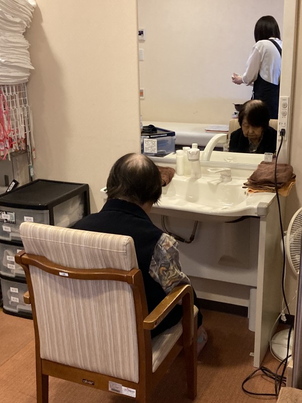 施設の浴室洗面台がカットスペース!カットのほか、ヘアカラーやパーマも対応してくださいます!