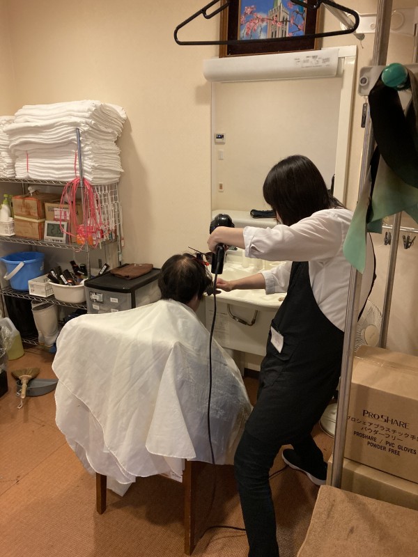 職員が洗面台へご案内すると、美容師さんがカットを進めていきます・・
