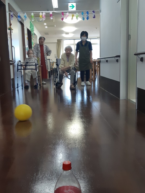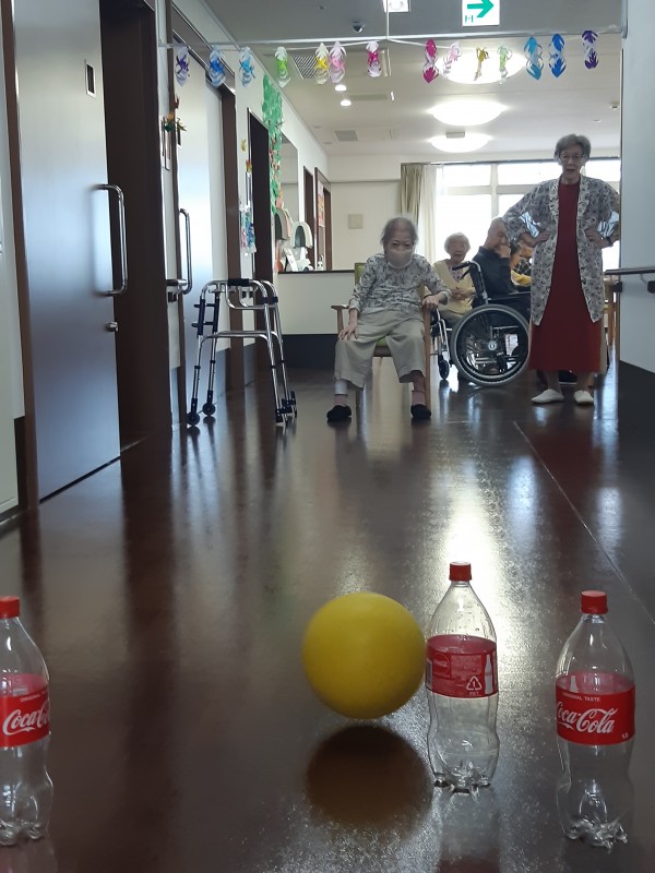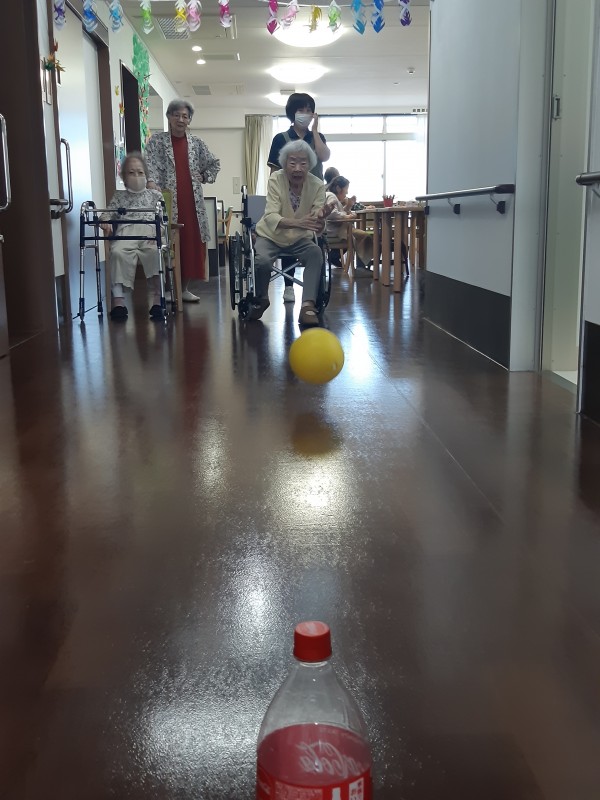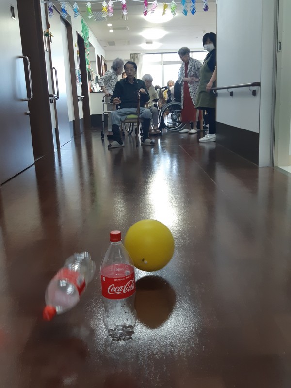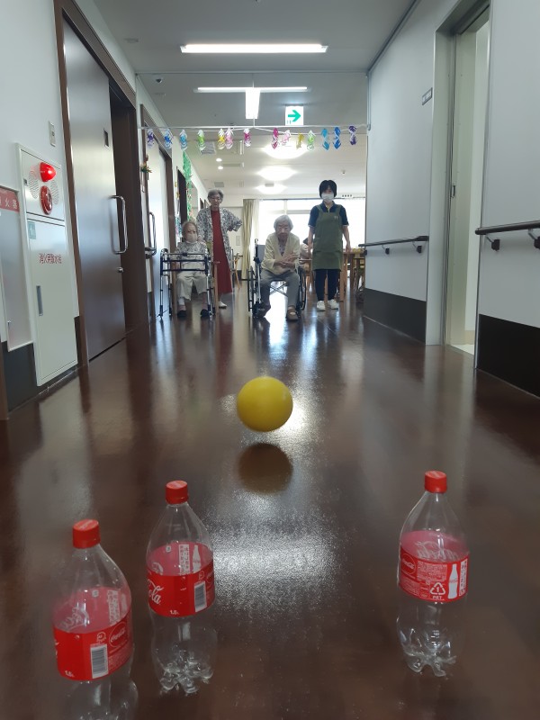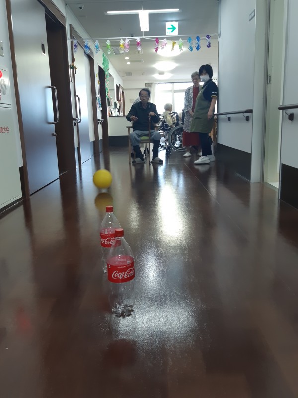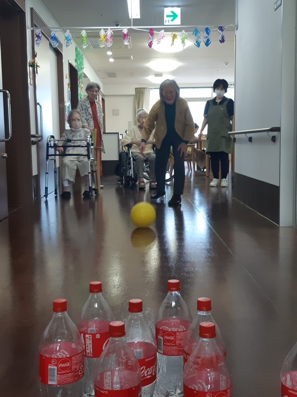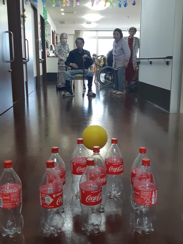 本日の3階では、ジュースの空きペットボトルを使用したボーリングレクを行いました!