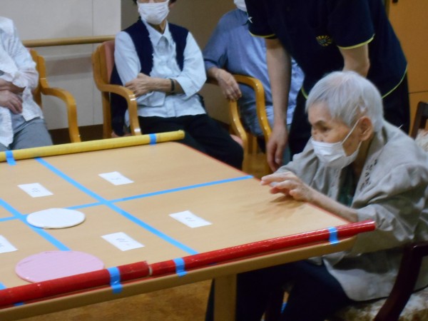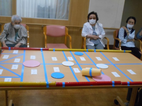 今日のレクリエーションは、ボールの入った紙コップを転がして点数を競うそーっとコロコロ!