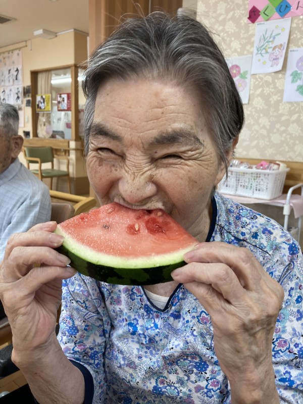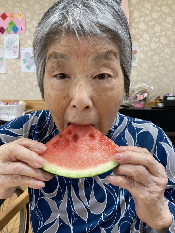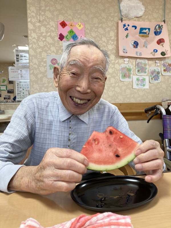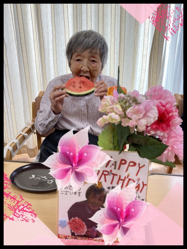 この日、95歳のお誕生日を迎えられたご利用者様をみんなで盛大に祝おうと『今年" 初"スイカ』でおもてなしをさせて頂きました(⋈◍>◡<◍)。✧♡
