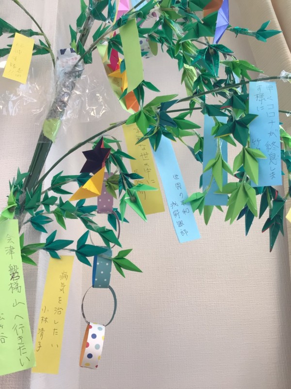 7月7日の七夕に向けて手作りの笹に皆さんで願いを込めて短冊に書いて飾りました。
