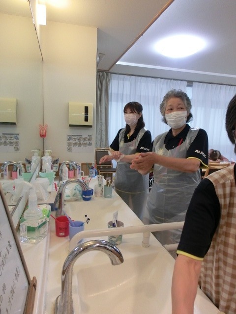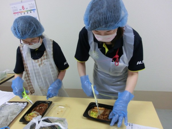 うがい、マスク、手袋、ガウンを身に着け刻み食の準備を行いました。