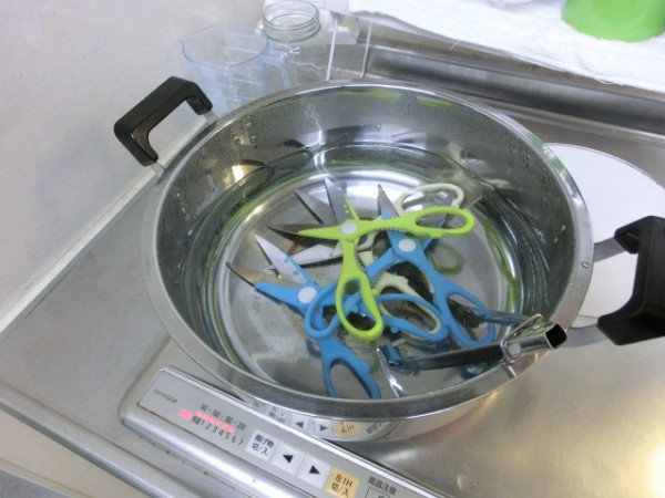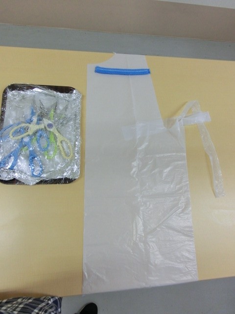 準備の様子の写真になります、しっかりハサミは熱湯消毒し、手洗い