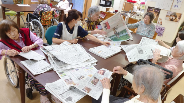 スタッフの新聞折を見ると入居者様が「私にもやらせて!」