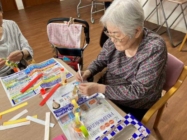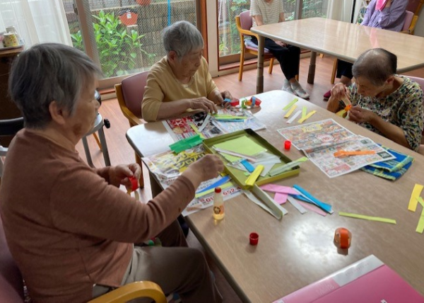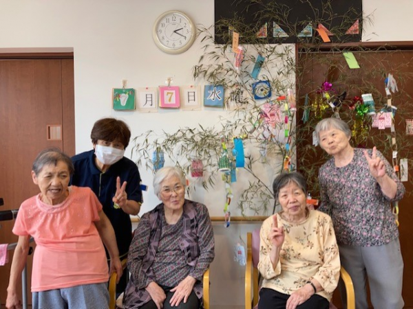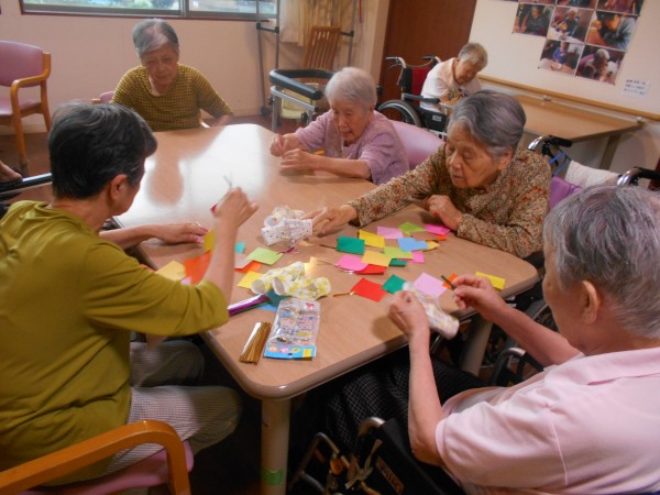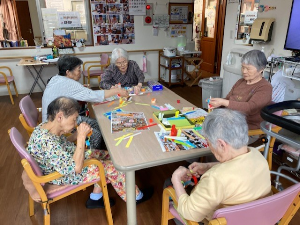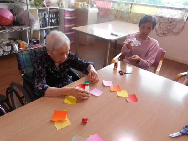 各フロアに1本ずつと玄関に置き、レクリエーションの時に利用者様とで飾り作りを行いました。