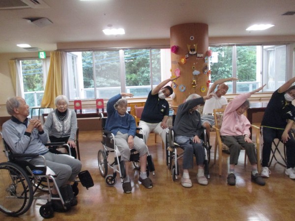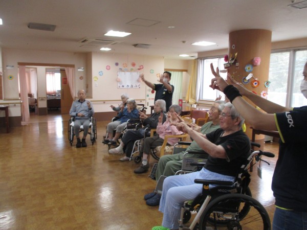 まず初めに、指と声に出して、日付けの確認を行いました。その後、足の運動と、音楽をかけて体幹のストレッチを行いました(^_-)-☆。