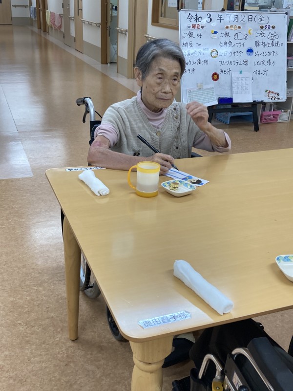 7月の七夕に向けてご入居者様に短冊を書いていただきました。皆さまの願いは何でしょうか。