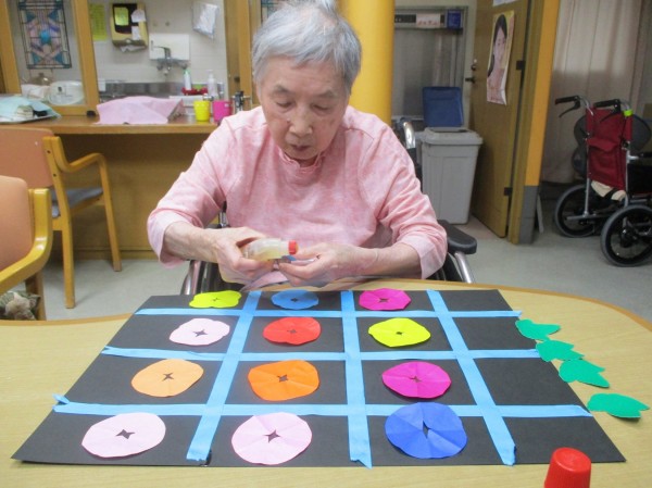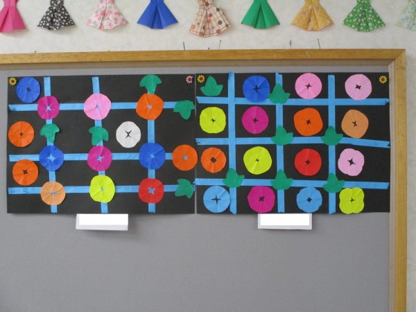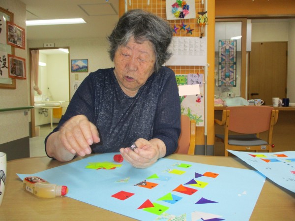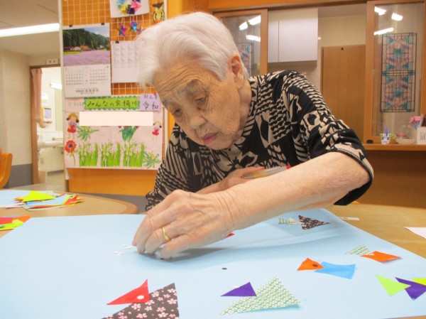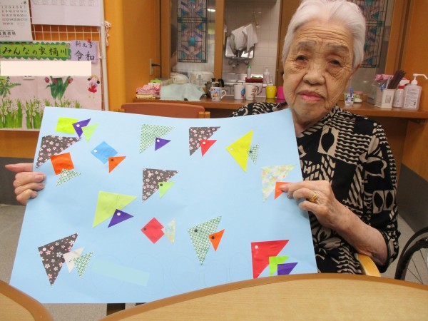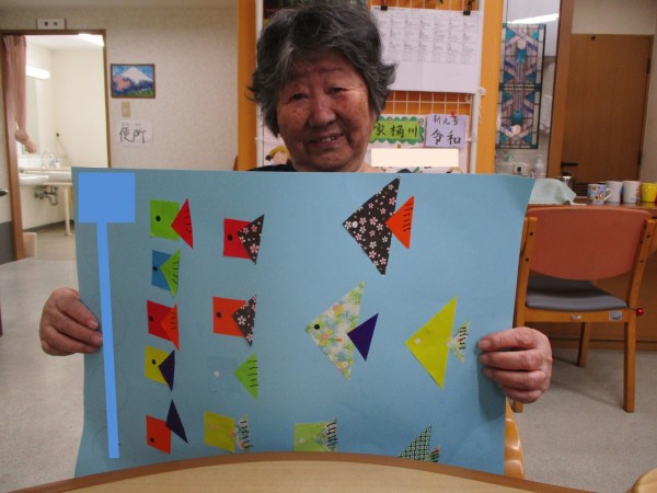 お魚に見立てた折り紙を画用紙に張り付けて…