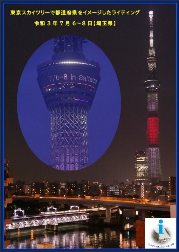 写真は職員が撮影した【東京スカイツリー聖火リレー47都道府県特別ライティング(埼玉県の県旗色をイメージしています)】です。