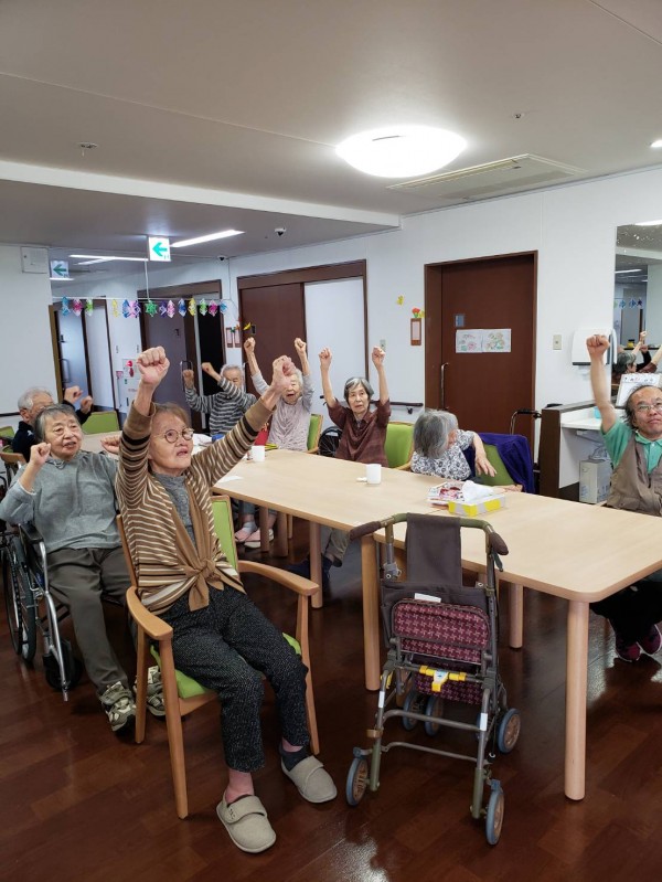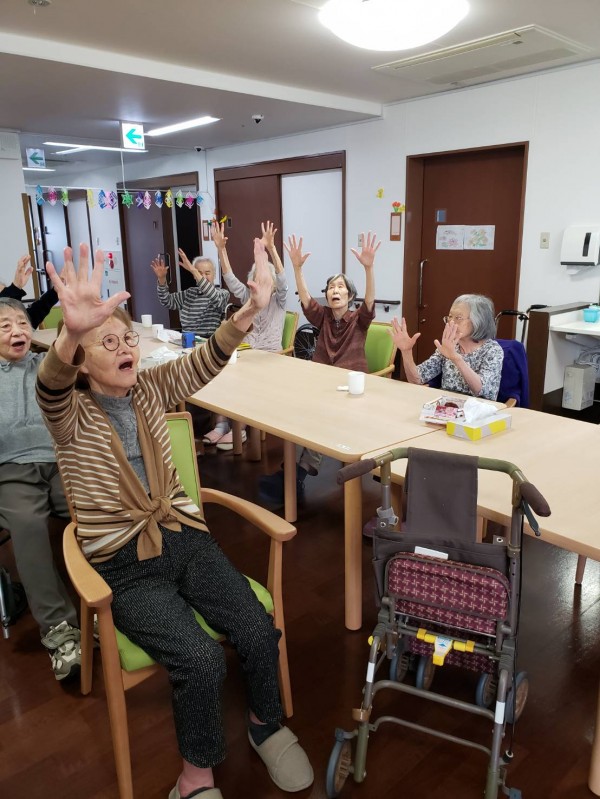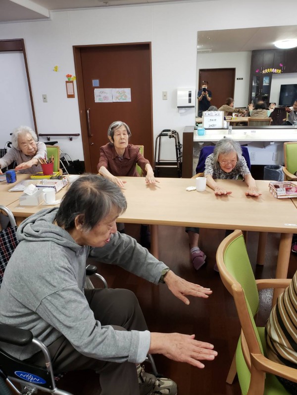 始めに両手を上げたり下げたり。背筋がピンと伸びて心なしか皆さんの目もともぱっちり。