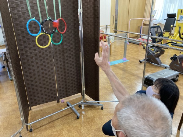 お手玉を投げて、五輪に見立てた輪に入れば成功です!